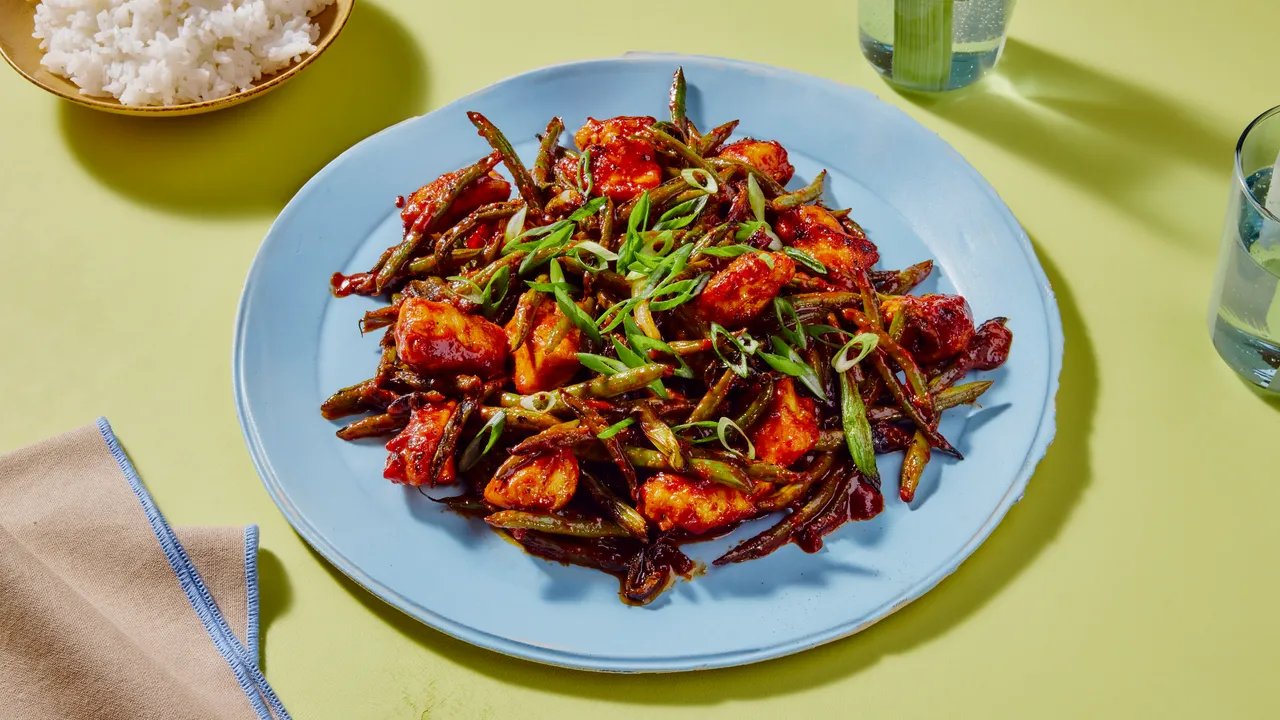 Reduce heat to medium and return green bean mixture to pan. Add reserved sauce and cook, stirring often, until sauce starts to cling to chicken and green beans, 1–2 minutes. Remove pan from heat and mix 1 tsp. toasted sesame oil into stir-fry.
